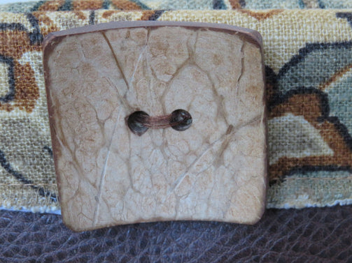 • Large, textured, square, light brown wooden button