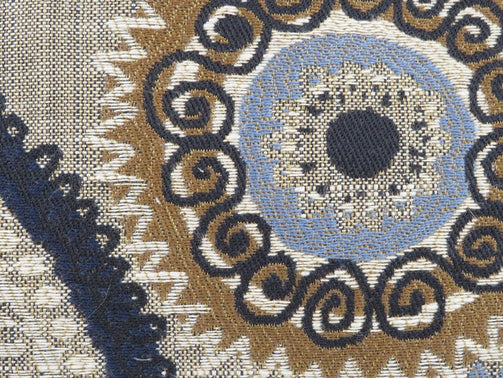 - Tan, chestnut brown, grayish blue, black pinwheel design