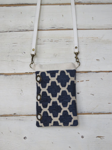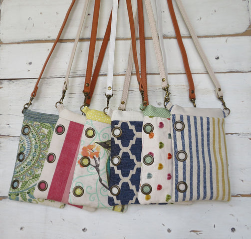 Each purse is one-of-a-kind, designed, and sewn one by one with lots of love. We use repurposed fabric swatches and remnants which would have normally been thrown into a landfill. We have four styles and two more on the way. Made in the USA.