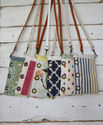 Each purse is one-of-a-kind, designed, and sewn one by one with lots of love. We use repurposed fabric swatches and remnants which would have normally been thrown into a landfill. We have four styles and two more on the way. Made in the USA.